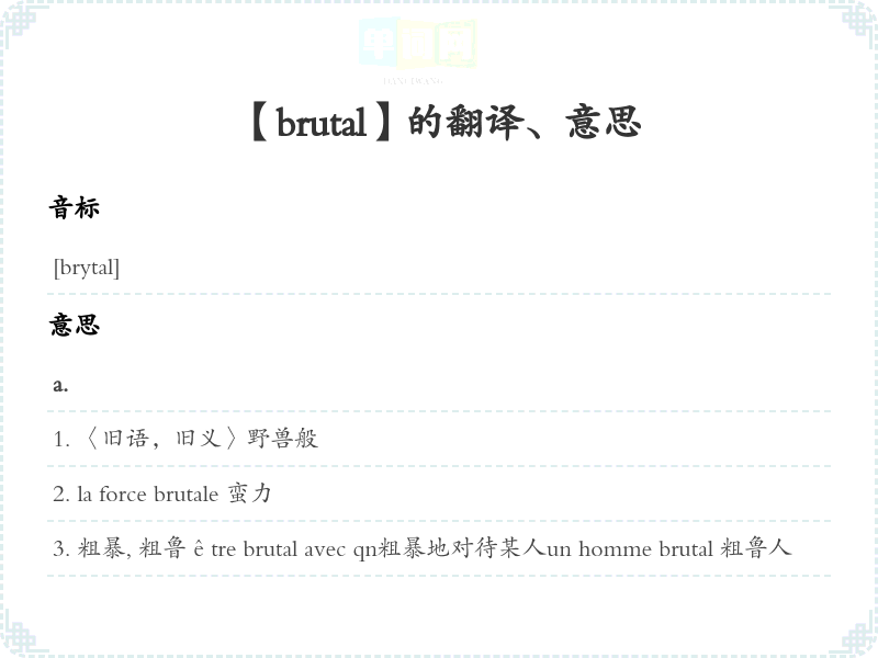 剧烈, 急剧;突然, 意外Le coup [Le choc] a été brutal .打击很剧烈。打击来得很突然。un changement brutal 急剧化lumière brutale〈引申义〉骤然映入眼帘强烈光线— n.粗暴人, 粗鲁人