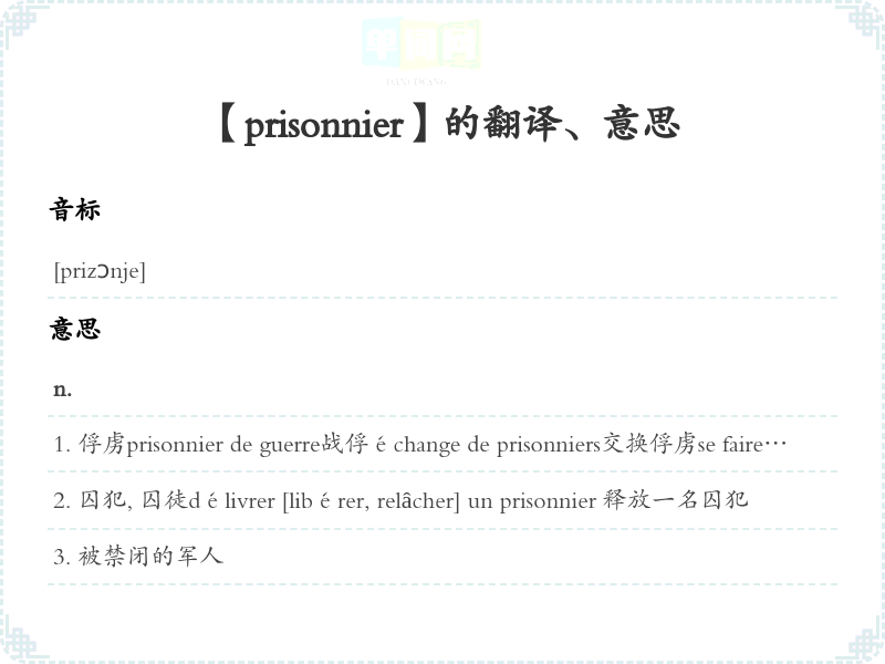 囚犯, 囚徒délivrer [libérer, relâcher] un prisonnier 释放一名囚犯