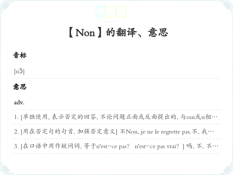 也不, 同样不Tu n'attends pas? Moi non plus.你不等了吗?我也不等了。non (pas) queloc.conj.并非, 并不因为 [后接subj.]Il aimait ce quartier de Paris, non pas qu'il fût beau, mais parce qu'il était tranquille.他喜欢巴黎的这一区, 并不因为这一区美丽, 而因为这一区安静。non (pas)..., mais...loc.adv.不…而…Écrivez ceci non pas de gauche à droite mais de haut en bas.这不要从左到右写, 而要从上到下写。non sansloc.prép.并非没有, 不无non sans peine并不不费力的non sans hésitation不无犹豫地non seulementloc.adv.不仅, 不但 [与连接词或连接词词组mais, mais encore, mais aussi, mais même(而且…, 还…)并用]Non seulement il a tort, mais encore s'obstine.他不仅错了, 而且还坚持。
