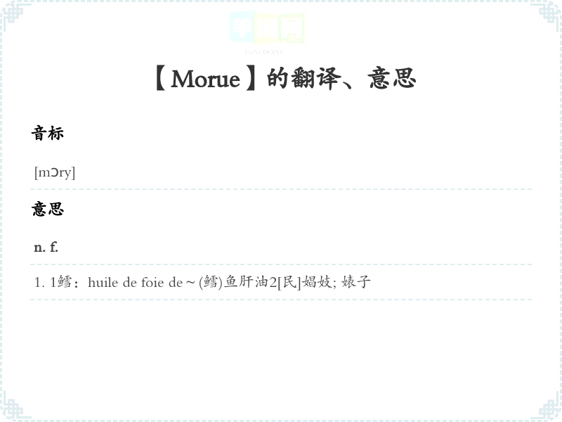 1鳕:huile de foie de~(鳕)鱼肝油2[民]娼妓; 婊子