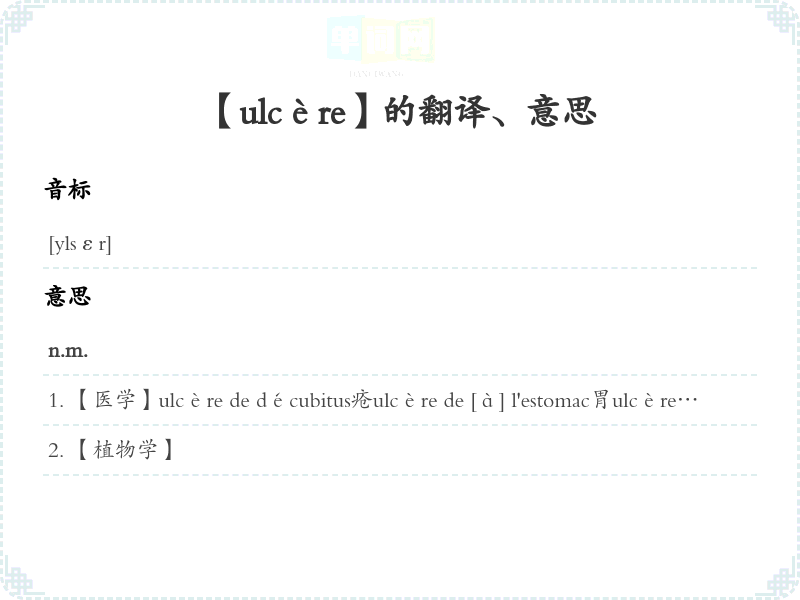 【医学】ulcère de décubitus疮ulcère de [à] l'estomac胃ulcère peptique消化ulcère variqueux静脉曲张