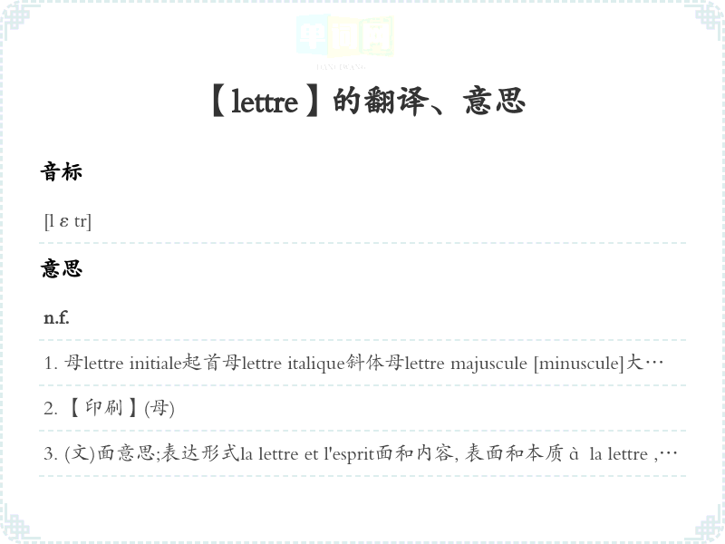 (文)面意思;表达形式la lettre et l'esprit面和内容, 表面和本质à la lettre , au pied de la lettre 按照面;严格地;一丝不差地lettre morte一纸空文;〈转义〉不起作用, 无用
