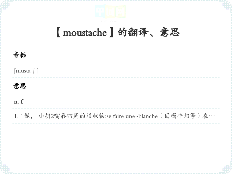 【moustache】 联想:、 近义词: 联想词