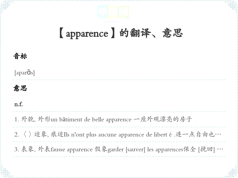 【apparence】 助记:、 词根:、 近词:、 反词: 联想词