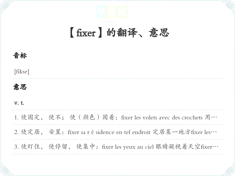 使固定, 使不; 使(颜色)固着:fixer les volets avec des crochets 用钩子固定百叶窗fixer un tableau sur le mur. 把一幅画固定墙上fixer les couleurs sur un tissu 使颜色织物上固着fixer qch sur le papier []把某事记下来fixer qch sur la toile []把某物画下来fixer une chose dans la mémoire (dans l'esprit) []把一件事情记脑子里