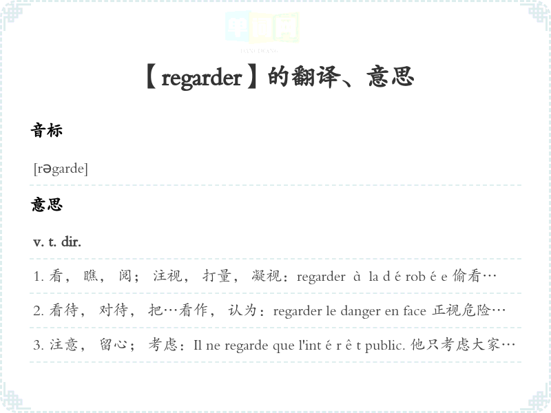 朝着, 面向:Cette maison regarde l'orient. 这座房子朝东。cette fenêtre regarde sur la mer. 这扇窗户向着大海v. t. indir. (+ à)重视; 考虑:regarder de près à qch 仔细考虑某事y regarder à deux fois 再三考虑ne pas regarder à la dépense 计较费用se regarder v. pr.