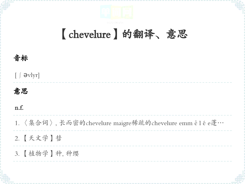 【chevelure】 联想:、 近义词:、 反义词: 联想词