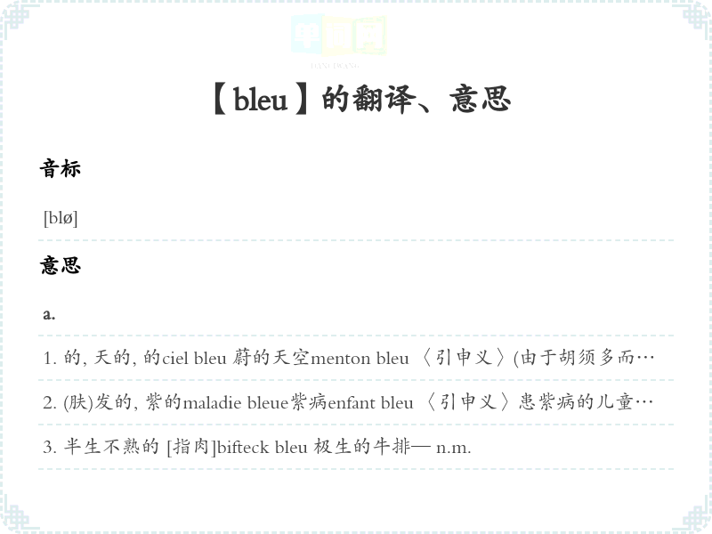 的, 天的, 的ciel bleu 蔚的天空menton bleu 〈引申义〉(由于胡须多而硬)剃得发的下巴颏conte bleu 〈转义〉〈旧语,旧义〉海外奇谈, 瞎扯的故事cordon bleu 〈转义〉高明的女厨师sang bleu 〈转义〉贵族出身le métal bleu 钴zone bleue地区 [指法国大城市内白天停车不得超过一小时的地区]