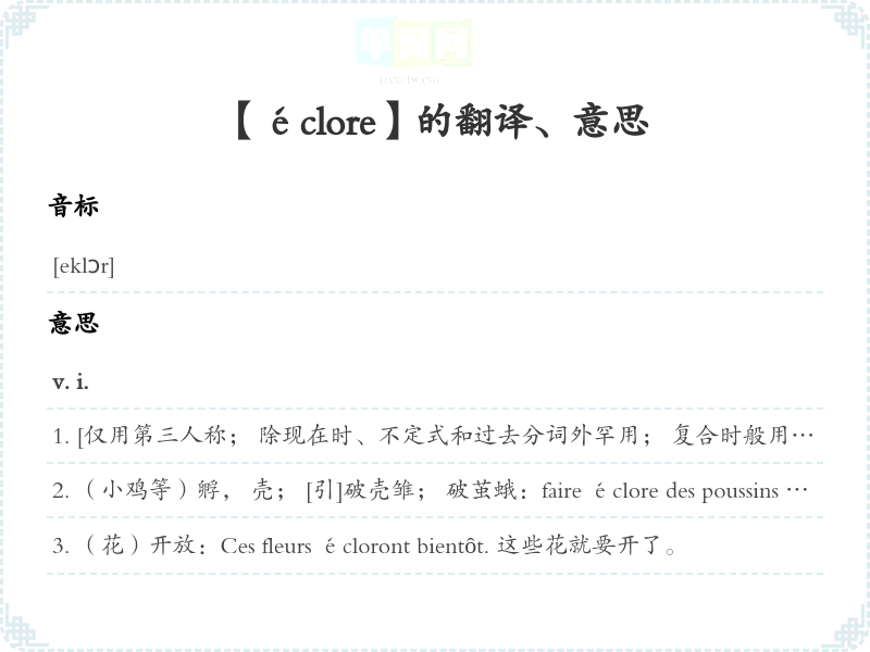 (小鸡等)孵, 壳; [引]破壳雏; 破茧蛾:faire éclore des poussins 孵小鸡faire éclore les vers à soie 孵蚕L'œuf est éclos. 蛋破壳雏了。