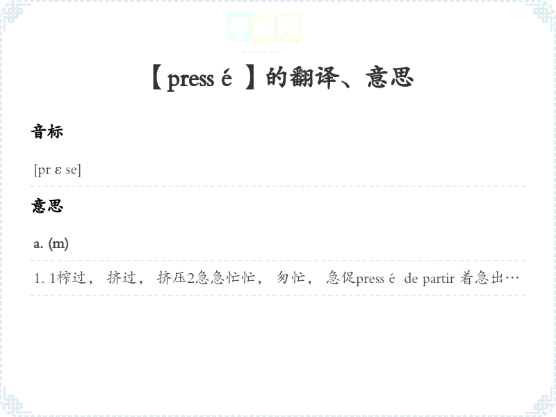1榨过, 挤过, 挤压2急急忙忙, 匆忙, 急促pressé de partir 着急出门3紧急, 急迫; 刻容缓travail pressé 紧急4猛攻, 紧逼5折磨