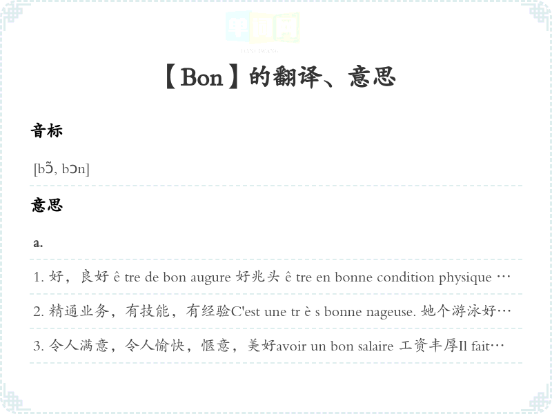 放在句首,表示祝愿Bonnes vacances ! 假期愉快!Bonne continuation 再接再励Bon rétablissement ! 早日康复!Bon voyage ! 旅行愉快!adv.sentir bon 香, 有香味 tenir bon 坚持coûter bon 价格昂贵Il fait bon. 气候宜人。天气好。Il fait bon dans ta chambre. 你卧室很温馨。Il fait bon se promener. 散散步非常愉快。Il ne fait pas bon avoir affaire à cet homme. 同这个人打交道真不愉快。同这个人打交道真危险。n.m.