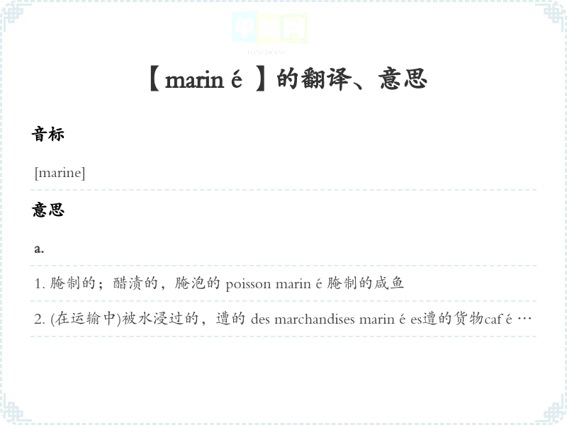 (在运输中)被水浸过的,遭的 des marchandises marinées遭的货物café mariné经水浸过的咖啡