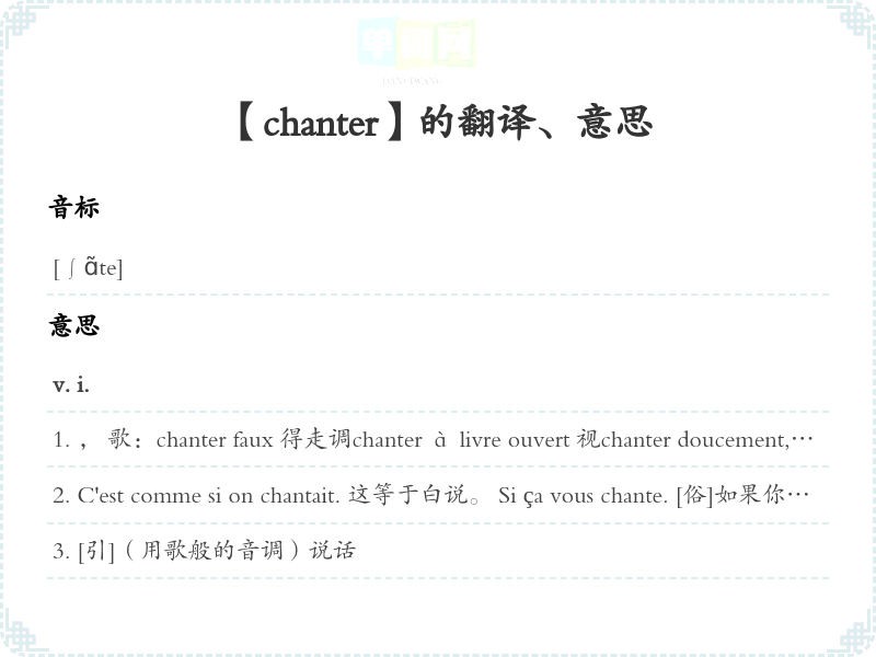 【chanter】 助记:、 词根:、 派生:、 名词化:、 形容词化:、 近义词:、 反义词: 联想词
