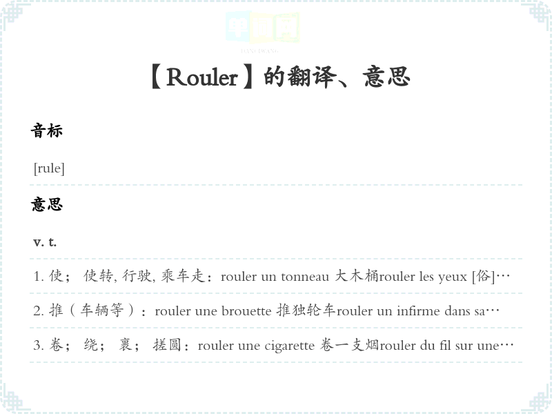 【Rouler】 助记:、 派生:、 联想:、 名词变化:、 形容词变化:、 近义词:、 反义词: 联想词