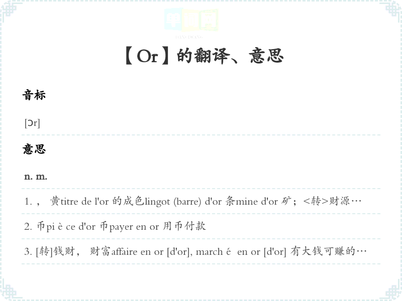 (用在句子的开头, 表示转折或对上半句话加以限制或修正)不过, 然而Or, il arriva ce que précisément il redoutait. 然而,他担心的事情还是发生了。Je ne le voyais plus, or un jour je l'ai rencontré dans la rue. 我没有再去看他,不过有一天我在街上碰到过他。