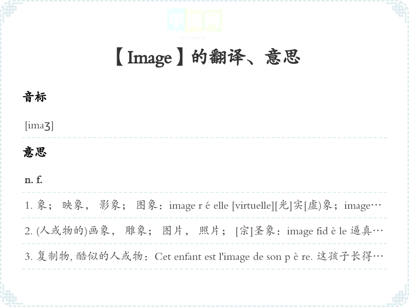 (人或物的)画象, 雕象; 图片, 照片; [宗]圣象:image fidèle 逼真的画像;un chasseur d'images 新闻片摄影师; 猎奇的摄影记者