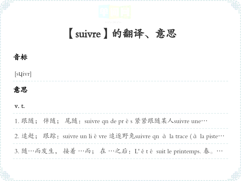 跟随; 伴随; 尾随:suivre qn de près 紧紧跟随某人suivre une procession 跟在行列后面suivre de l'œil 盯,紧盯Nous suivons l'avions dans le ciel. 我们看着飞机在天空飞过。faire suivre qn 叫人跟踪某人suivre le mouvement 随大流