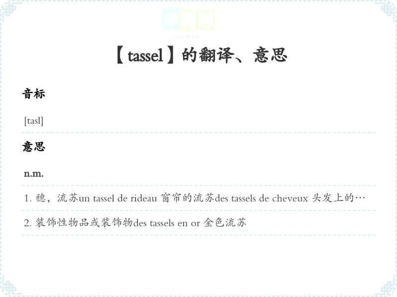 穗,流苏un tassel de rideau 窗帘的流苏des tassels de cheveux 头发上的流苏