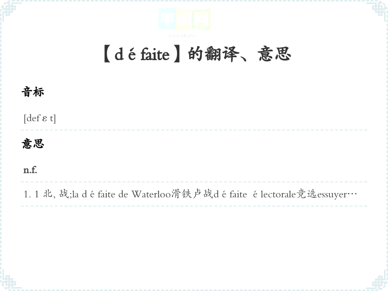 1 北, 战;la défaite de Waterloo滑铁卢战défaite électorale竞选essuyer une défaite 吃仗, 遭受