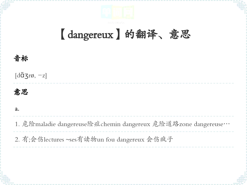 危险maladie dangereuse险症chemin dangereux 危险道路zone dangereuse d'un front前线危险地带s'engager sur un terrain dangereux 〈转义〉陷入危险境地Il est dangereux de se pencher dehors.身子探出窗外是有危险。