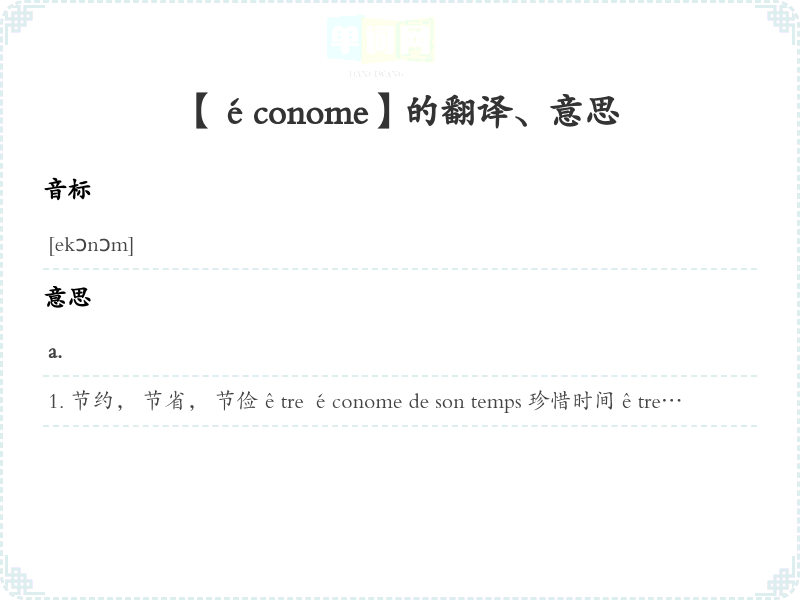 节约, 节省, 节俭être économe de son temps 珍惜时间être économe d'éloges 不轻易赞扬n.1<旧>管家 2(学校、养老院、宗教团体等)管事, 总务, 庶务旧>