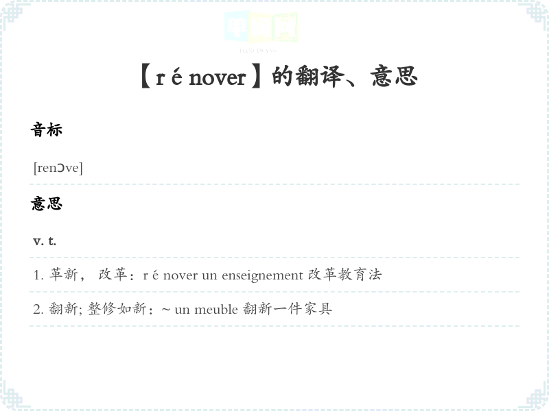 【rénover】 派生:、 近义词:、 反义词: 想词