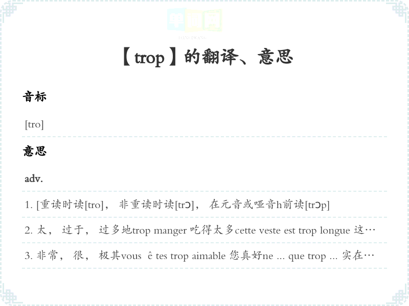 [用作n. m. ]过分, 过多, 太多En tout. le trop ne vaut rien. <谚>凡事过犹不及。C'est trop! 您过奖!多谢您礼物!de trop, en trop 多喝一口Les deux yuans sont de trop. 这两元钱是多出来。trop de (+n.) 太多谚>n. m.过分, 过多le trop de confiance attire le danger (Corneille) 过多信任会带来危险。(高乃依)