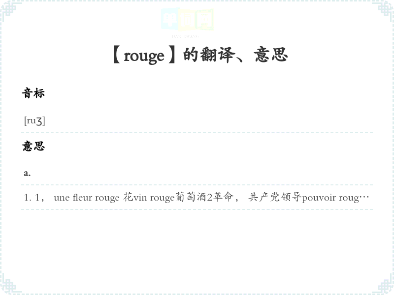 1, une fleur rouge 花vin rouge葡萄酒2革命, 共产党领导pouvoir rouge 政权3烧, 热得发fer rouge 烧铁tison rouge 烧木柴4脸; 涨, 充血être rouge de colère因生气而脸être rouge de honte因羞愧而脸5棕[指毛发]n. m1, rouge vif 鲜2颜料, 染料mettre du rouge en palette 在调板上放颜料3颜美容品; 胭脂rouge à lèvres 口4烧5(由于羞愧、发怒等而)变脸6(命令停止前进或表示危险); 部分7 pl. 对革命或共产党人称呼8<口>葡萄酒; 杯葡萄酒口>
