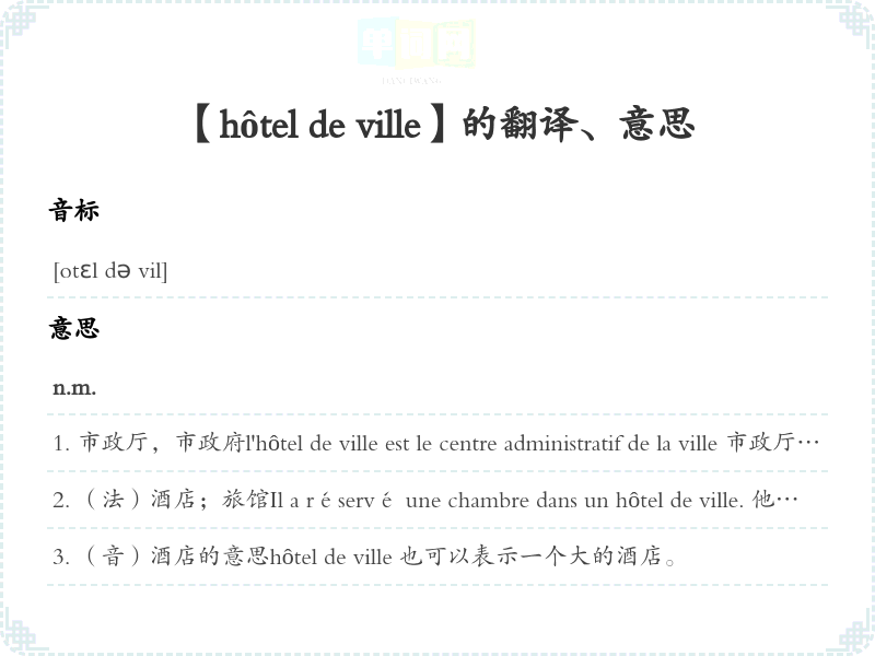 (音)酒店的意思hôtel de ville 也可以表示一个大的酒店。