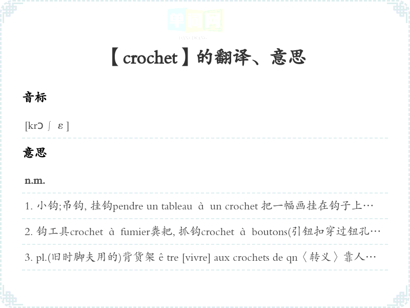 【crochet】 动词变化:、 名词变化:、 容词变化:、 近义词:、 反义词: 联想词
