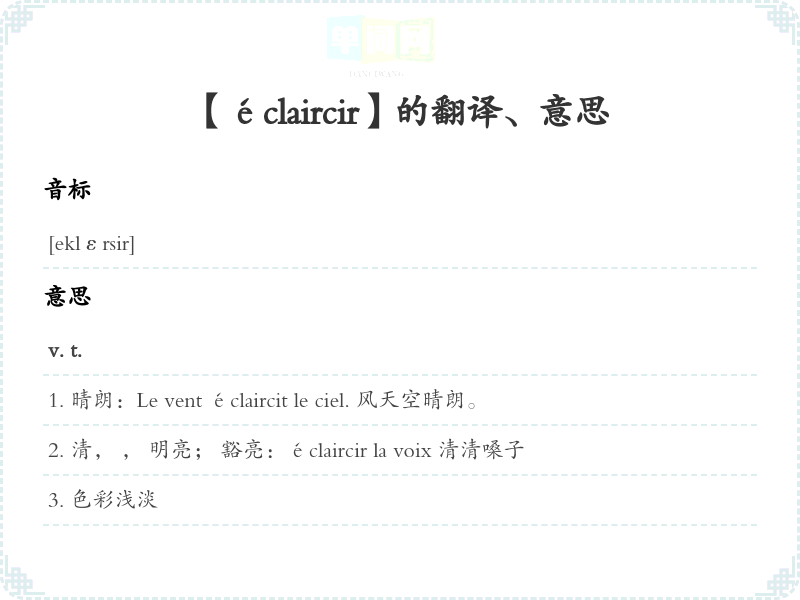 清, , 明亮; 豁亮:éclaircir la voix 清清嗓子