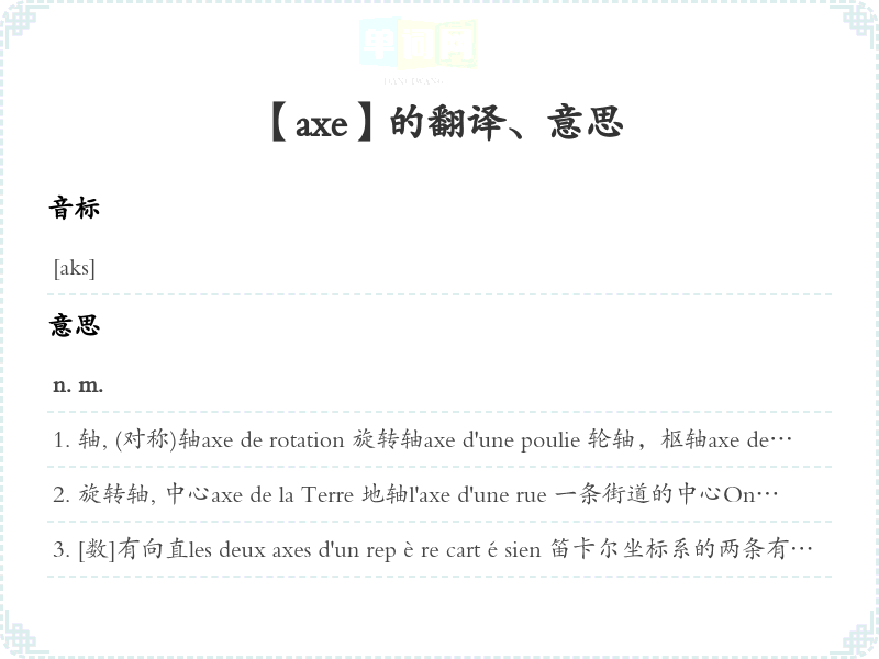 轴, (对称)轴axe de rotation 旋转轴axe d'une poulie 轮轴,枢轴axe de symétrie 对称轴axe du corps 体轴