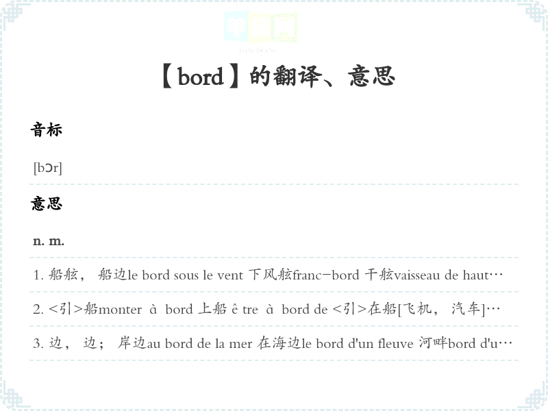【bord】 词根:、 派生:、 联想、 动词变化:、 近义词、 反义词、 同音、近音词 联想词