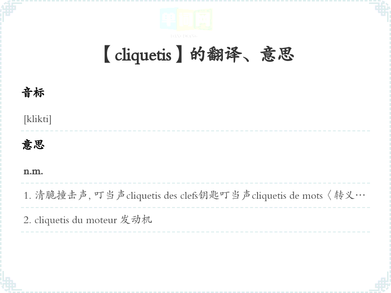 清脆撞击声, 叮当声cliquetis des clefs钥匙叮当声cliquetis de mots〈转义〉铿锵而空洞话