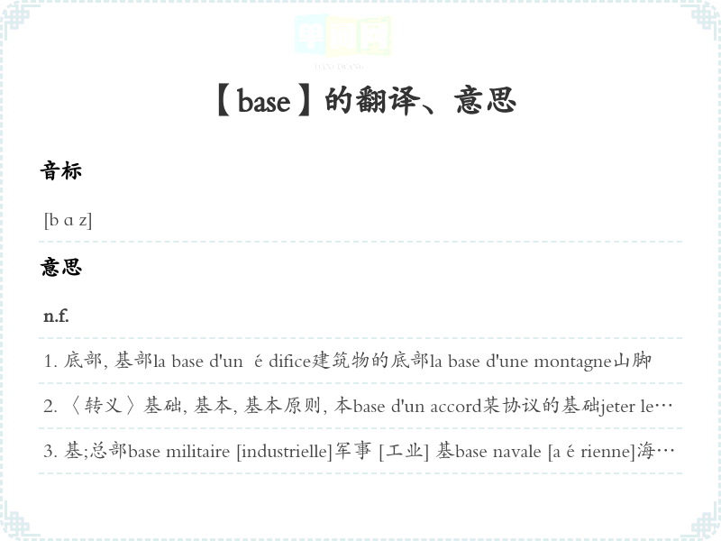 〈转义〉基础, 基本, 基本原则, 本base d'un accord某协议的基础jeter les bases de qch.奠定…的基础sur la base de在…基础上à base de:以…为原料: un cocktail à base de gin 以杜松子酒为主调制的鸡尾酒salaire de base 基薪, 底薪avoir de bonnes bases en mathématiques数学基础扎实