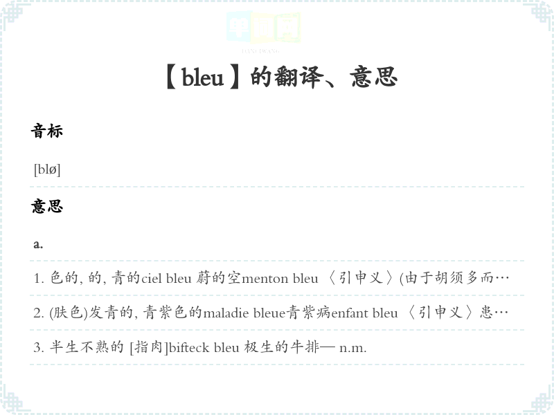 色的, 的, 青的ciel bleu 蔚的空menton bleu 〈引申义〉(由于胡须多而硬)剃得发青的下巴颏conte bleu 〈转义〉〈旧语,旧义〉海外奇谈, 瞎扯的故事cordon bleu 〈转义〉高明的女厨师sang bleu 〈转义〉贵族出身le métal bleu 钴zone bleue色地区 [指法国大城市停车不得超过一小时的地区]