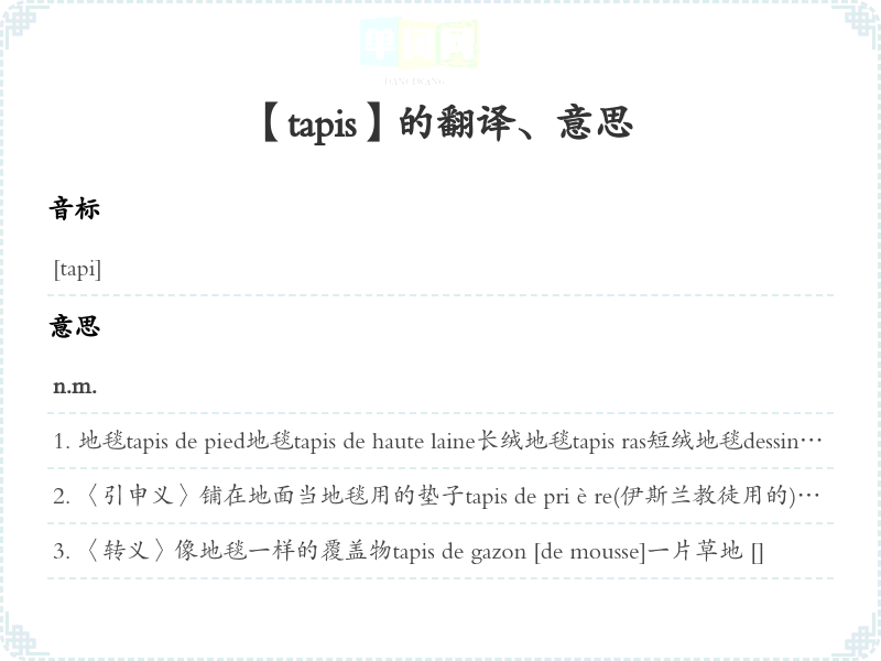 地毯tapis de pied地毯tapis de haute laine长绒地毯tapis ras短绒地毯dessins d'un tapis 地毯上的图案tapis de couloir铺走廊用地毯un carré de tapis 一方地毯marchand de tapis 地毯商;〈转义〉〈贬义〉价还价的人;纠缠不清的人