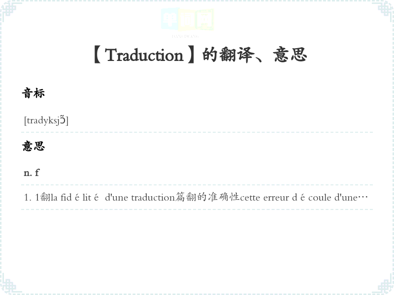 1翻la fidélité d'une traduction篇翻的准确性cette erreur découle d'une faute de traduction这个错误来自个翻失误Il est écrivain mais son gagne-pain c'est la traduction他是作家但他靠翻谋生2文, une traduction des œuvres de Dostoievski陀思妥耶夫斯基作品的文3<转>表达转>La traduction est exacte de sa pensée.准确地表达了他的思想。
