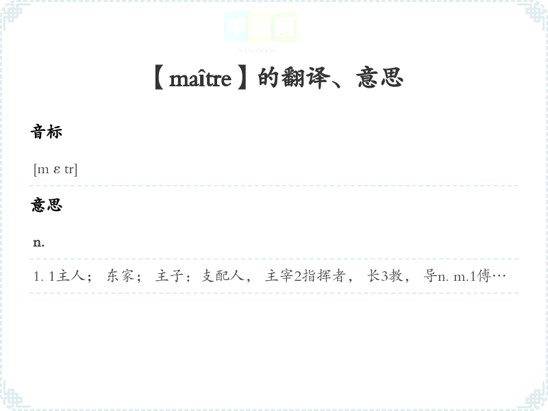 1主人; 东家; 主子:支配人, 主宰2指挥者, 长3教, 导n. m.1傅; 能手2(法国)海军上士3(主持画室、雕刻室)画, 雕刻4(文学艺术)大, 名家, 巨匠5对名作家. 名艺术家或名教授尊称; 对、公证人等尊称6傅, 老板(过去对农民、手工业者称呼)a.1主人般, 管家maître cuisinier 厨长2能干, 有能力une maîtresse femme 一个能干女人3为首; 第一流poutre maîtresse 主梁4主要, 重要, 首要; 起作, 有l'idée maîtresse d'un ouvrage 一部著作主要思想