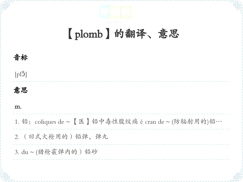 铅:coliques de ~ 【医】铅中毒性腹绞痛écran de ~ (防辐射用的)铅屏mine de ~ 石墨soldats de ~ 铅制玩具兵tuyau de ~ 铅管essence sans ~ 无铅汽油de [en] ~ <转>沉重的:sommeil de ~ 沉睡,睡得很熟ciel de ~ 铅灰色的天空avoir des jambes de [en] ~ 两腿沉重转>