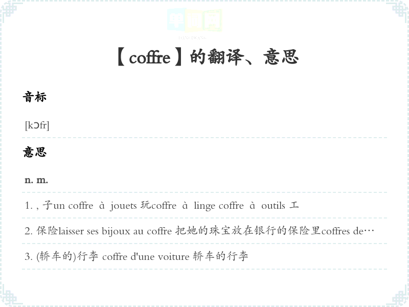 保险laisser ses bijoux au coffre 把她的珠宝放在银行的保险里coffres de l'État 国库