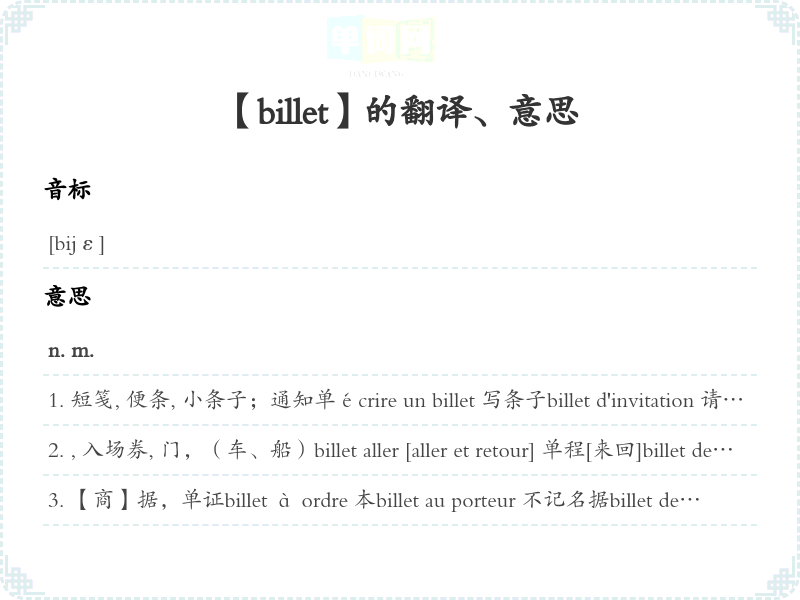【billet】 联想:、 名词变化:、 动词变化:、 近义词: 联想词