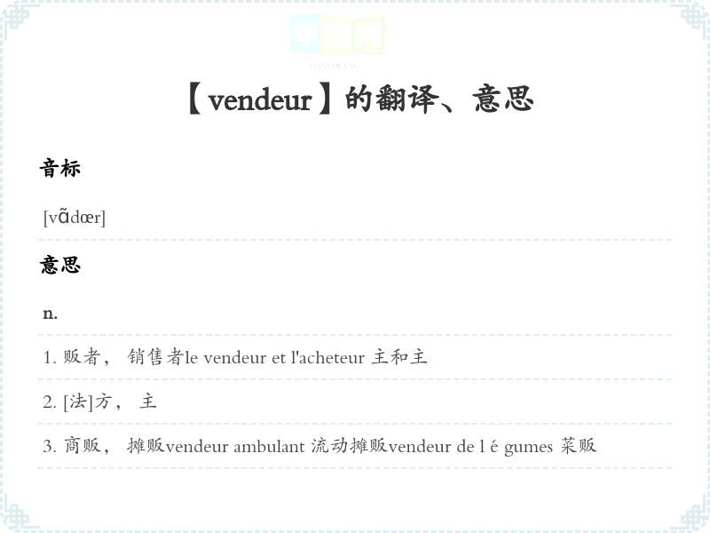 生意,Le directeur commercial est un excellent vendeur. 销售部经理是一位出色的生意。a.准备出售的, 促销的un slogan accrocheur et vendeur 一句诱 促销广告