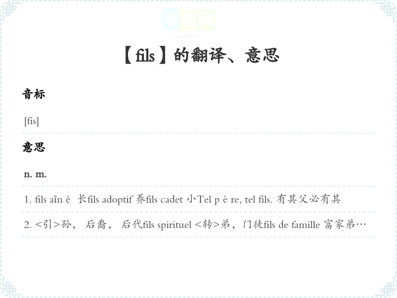 fils aîné 长fils adoptif 养fils cadet 小Tel père, tel fils. 有其父必有其