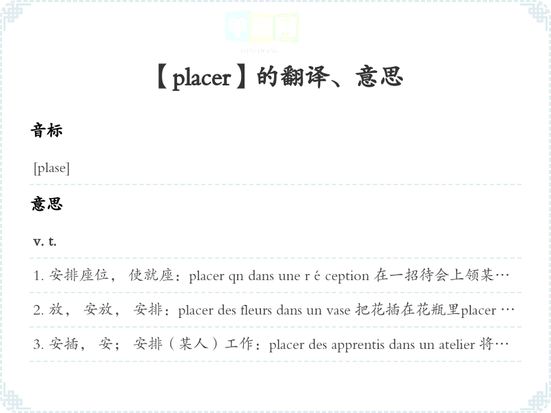 【placer】 :、 联想:、 近义词:、 反义词: 联想词
