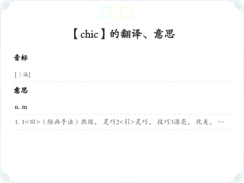 1<旧>(绘画手法)熟练, 灵巧2<引>灵巧, 技巧3漂亮, 优美, 雅致, 别致, 潇洒avoir du chic 很漂亮,很潇洒manquer de chic 不雅致4欢呼, 喝彩, 鼓掌[学生语]引>旧>adj. inv.1漂亮的, 雅致的, 别致的, 潇洒的2<口>美好的3<口>慷慨的, 大方的, 热心的口>口>interj.<口>太美了!太好了!口>de~adv. [短语]<旧>不加准备地, 即兴地旧>il exécutait ses œuvres de chic (Daudet)他总是胸有成竹地完成自己的作品(都德)