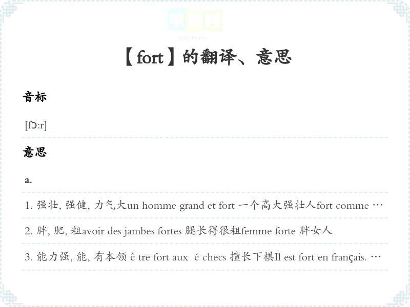 能力强, 能, 有本领être fort aux échecs 擅长下棋Il est fort en français. 他法语很棒。C'est une tête forte. 这是一个能力很强人。Il est toujours très fort pour parler.〈语〉他一向善于辞令。[用作 n.]C'est un fort en gueule. 这是个嘴巴厉害人。Il n'est pas très fort! 他没有什么了不起!