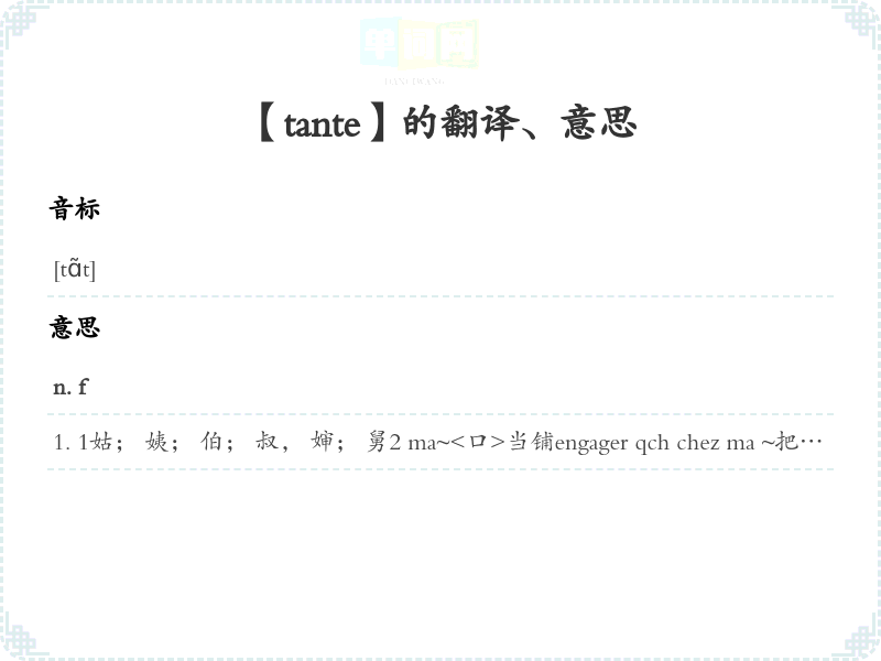 1姑; 姨; 伯; 叔, 婶; 舅2 ma~<口>当铺engager qch chez ma ~把某物当掉3<俗>男同性恋者俗>口>