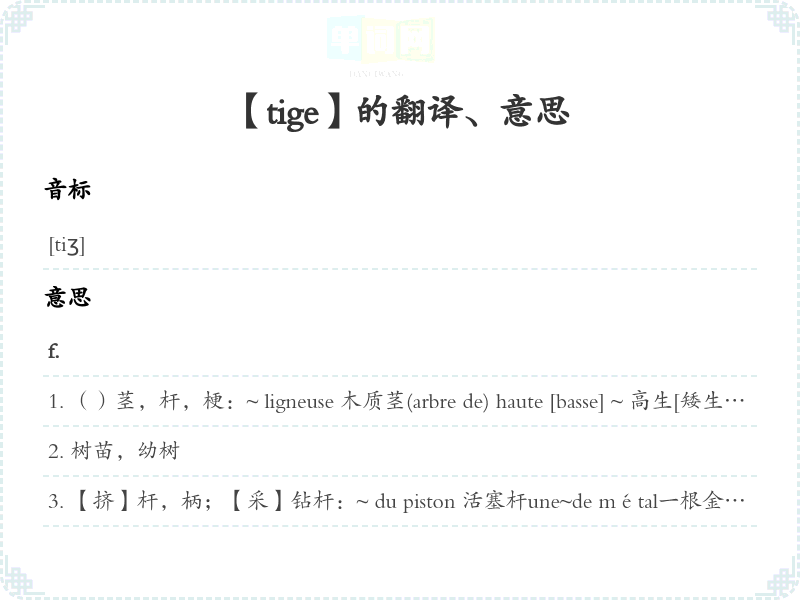 香烟,纸烟常见用法une tige de bois一根木杆une tige de métal一根金属杆口>转>转>
