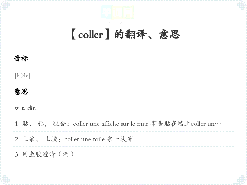 [俗]缠住(人)v. t. indir. (+ à)粘,粘住;[转]贴切, 切合, 符合, 适合:mot qui colle à une idée 贴切地表达一思想的词Cette description colle à la réalité. 这描写是符合实际的。v. i.